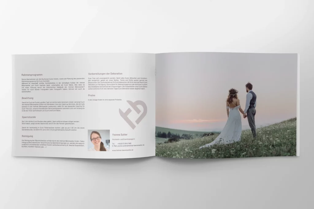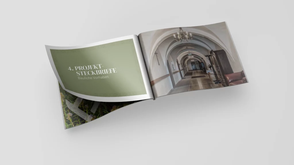An die konzeptionelle Arbeit schloss die Umsetzung in verschiedene Kommunikationsmittel an: eine Bankettmappe für Hochzeiten in Form einer Broschüre, verschiedene Preislisten, ein Bau- und Umsetzungskonzept in Form eines Buches, Flyer, Sammelkarten, Onlinemarketing über Social-Media-Kanäle und vor allem: eine Typo3 Website, als zentrales Element der Kommunikation.